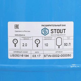 Бак расширительный для водоснабжения 50 л STOUT предназначен для поддержания постоянного давления в системах индивидуального и промышленного водоснабжения, компенсации гидроударов при изменении давления и накапливания воды. Преимущества гидроаккумуляторов STOUT: низкие расходы при эксплуатации; легкий монтаж; безопасность; надежность; установка в любой части дома; отсутствие потери рабочей среды; минимальные теплопотери за счет отсутствия испарения; минимальная подача воздуха; мембраны из натуральной резины и бутила могут применяться в питьевом водоснабжении; возможно использовать различные виды теплоносителя.