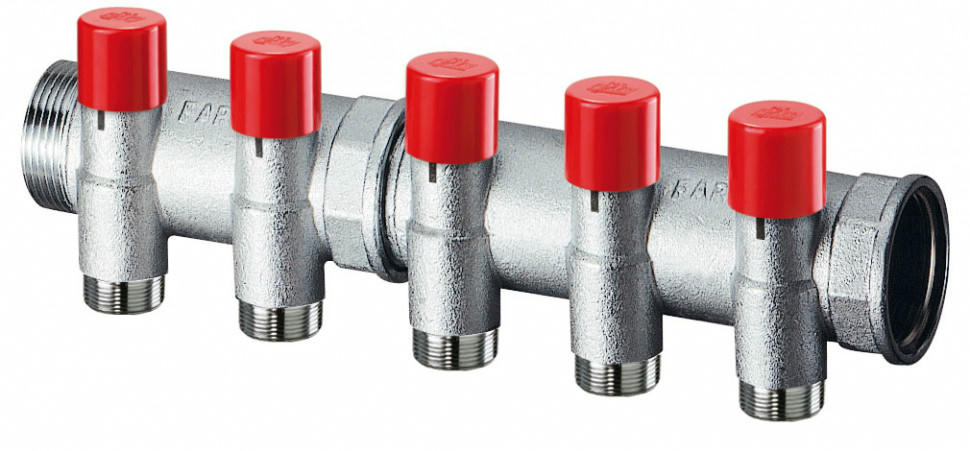 Коллектор FAR FK 3923 с защитными красными колпачками ? это модификация коллектора с запорными вентилями, который позволяет не только точно произвести балансировку контуров, но и визуально контролировать положение клапана, т.к. регулирующая ручка модифицированного коллектора снабжена шкалой поворотов открытия клапана.
