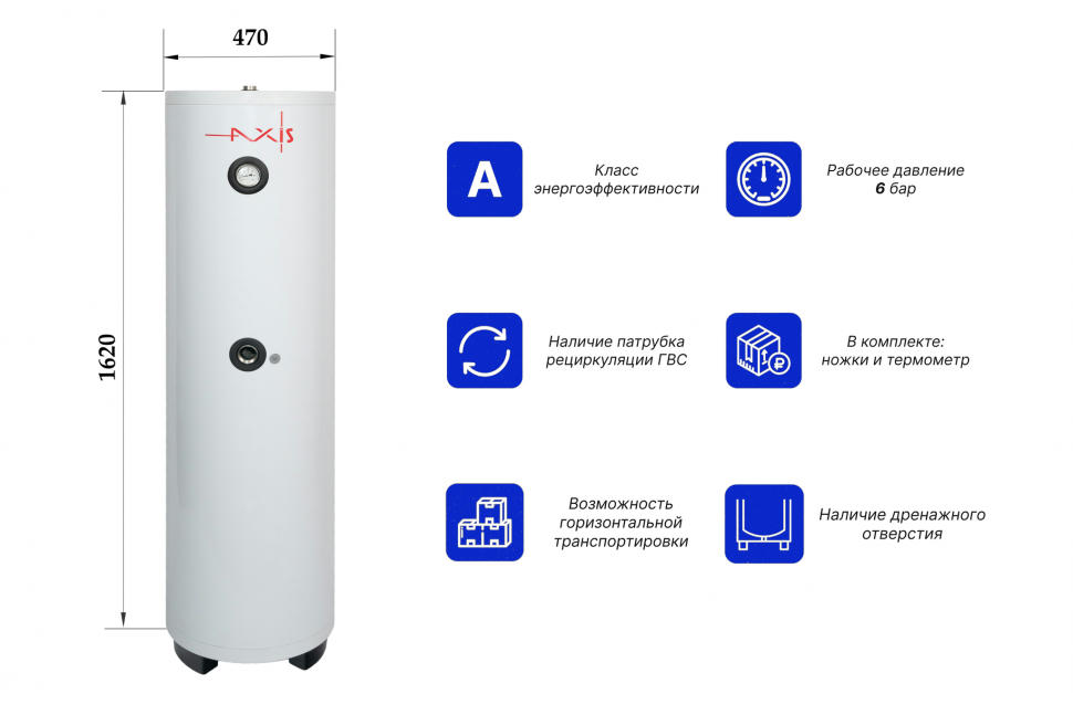 Водонагреватель косвенного нагрева AXIS THERM X со встроенным теплообменником из нержавеющей стали и возможностью дополнительной установки электрического нагревательного элемента является универсальным оборудованием для загородного дома или коттеджа.