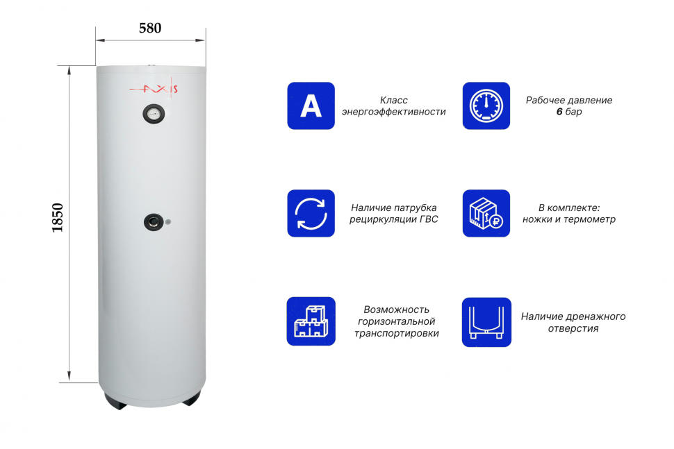 Водонагреватель косвенного нагрева AXIS THERM X со встроенным теплообменником из нержавеющей стали и возможностью дополнительной установки электрического нагревательного элемента является универсальным оборудованием для загородного дома или коттеджа.