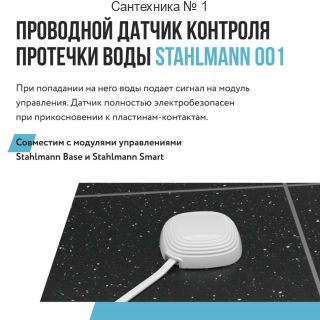 Проводной датчик контроля протечки, при попадании на него воды подает сигнал на модуль управления. Является электробезопасным при прикосновении к пластинам-контактам. Совместим с модулями управлениями Stahlmann Base и Stahlmann Smart.