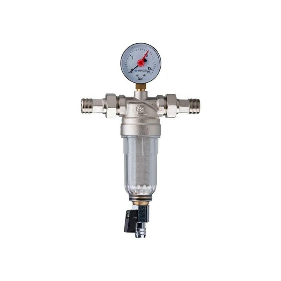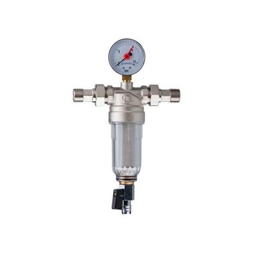 Фильтр промывной с манометром, разъемными соединениями, пластиковой колбой Tiemme 3/4" предназначен для очистки потока воды от механических примесей в системах трубопроводов горячей и холодной воды. Фильтр встраивается в бытовую систему после счетчика воды перед редуктором давления. Изделие защищает установленное оборудование от различных примесей, переносимых водой. Максимальная рабочая температура +65 оС, максимальное рабочее давление ? 16 бар. Манометр, входящий в комплект, показывает давление воды на выходе фильтра и имеет индикатор максимального давления для регулировки на этапе монтажа системы ? падение давления, образующееся при фильтрации, позволяет проверить степень засорения фильтра. Хвостовики с накидными гайками могут устанавливаться на корпусе фильтра различными способами: с выходным хвостовиком, с входным хвостовиком и с выходной гайкой.