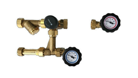 Арматурная группа со смесителем для подключения отопительного контура к коллекторам BLH. Необходима дополнительная комплектация циркуляционным насосом с длиной 130 мм и диаметром подключения 1", а также сервоприводом. Подходит для подключения отопительного контура с управлением по датчику наружной температуры при помощи любого подходящего электронного контроллера. В состав группы входит: поворотный смеситель ARV 362 Proclik (kvs 6,3), сетчатый фильтр, запорные шаровые краны со встроенными термометрами, обратный клапан, встроенный в тройник на обратном патрубке, втулки для крепления датчиков температуры на подающей и обратной линиях, прокладки для соединения с коллектором. Группу можно использовать для подключения как слева, так и справа.