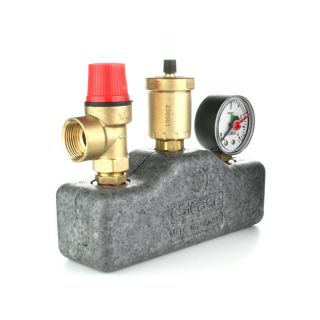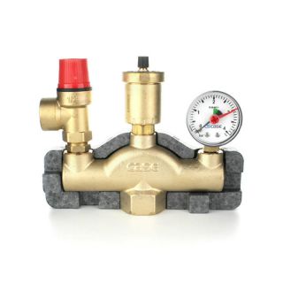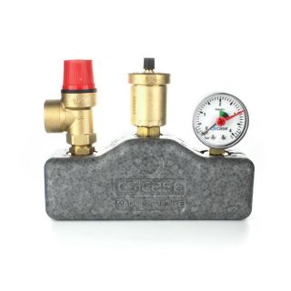 Группа безопасности котла ELSEN для защиты закрытых систем отопления до 50 кВт, состоит из мембранного предохранительного клапана, автоматического воздухоотводчика и манометра. Рабочая температура от -10°С до 120°С. Группа может вращаться относительно вертикальной оси для легкого доступа к показаниям манометра.