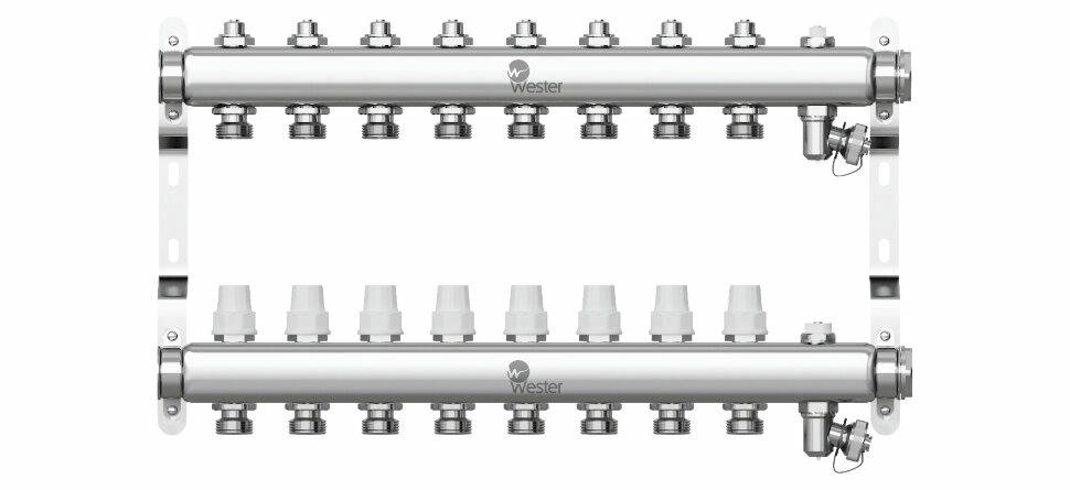 Оцените товар «Коллектор из нержавеющей стали 1"-3/4 в сборе на 8 выходов с 2 заглушками Wester»