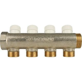 Коллектор распределительный 1" на 4 отвода 3/4" ЕК, никелированный STOUT ? предназначены для распределения потока транспортируемой среды по потребителям путем перекрытия и регулировки клапанов на отводах. Коллекторы могут использоваться на трубопроводах систем холодного и горячего водоснабжения, а также для транспортировки жидкости, не агрессивной к материалам элементов коллекторных систем.