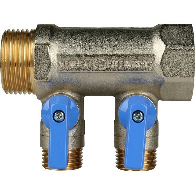 Оцените товар «Коллектор распределительный 1 с запорными кранами и 2 отводами 1/2, ручки синие STOUT»