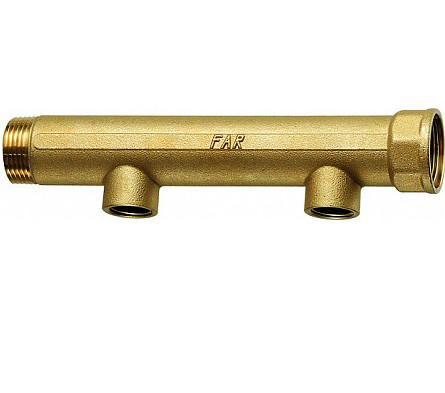 Латунная гребенка FAR FK 3611 распределительная проходная с 2 отводами 1/2" или 3/4? ВР (без покрытия). Коллекторы с увеличенным расстоянием между отводами (100 мм) рекомендуется устанавливать на магистральных участках распределения: в коттеджных котельных или в домовых участках ввода водоснабжения. Межосевое расстояние отводов коллекторов FAR FK 3611 позволяет устанавливать на них не только шаровые краны, но и водосчетчики и моторизованные шаровые краны FAR.