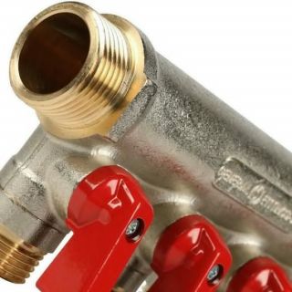 Коллектор распределительный 3/4 с запорными кранами и 4 отводами 1/2, ручки красные STOUT