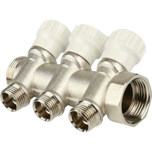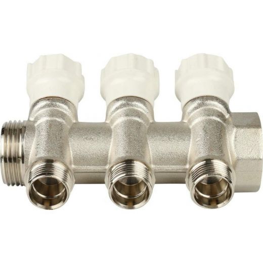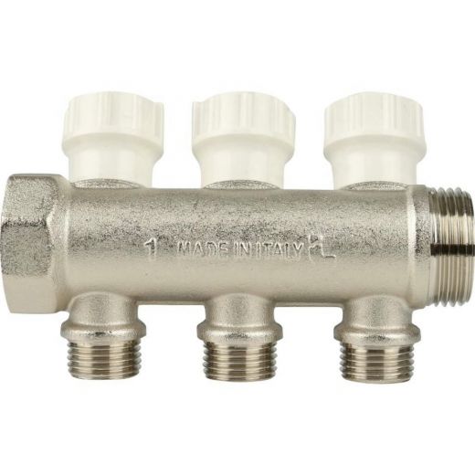 Оцените товар «Коллектор распределительный регулируемый НВ 1" 3 выхода1/2" Н 38 мм с вентилями, никелированный Itap»