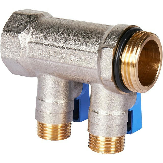 Коллектор распределительный с шаровыми кранами 1" с 2 отводами 1/2" (синие ручки), никелированный STOUT