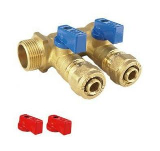 Коллектор распределительный с шаровыми кранами 1" с 2 выходами 20, красные и синие ручки TIM
