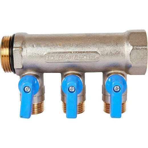 Оцените товар «Коллектор распределительный с шаровыми кранами 1" с 3 отводами 1/2" (синие ручки), никелированный STOUT»