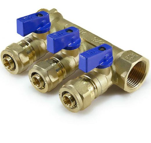Оцените товар «Коллектор распределительный с шаровыми кранами 1" с 3 выходами, синие ручки TIM»