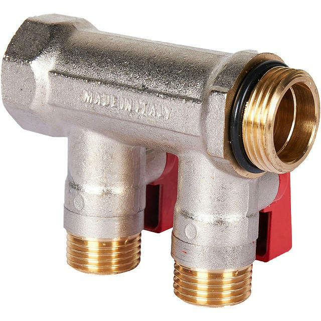 Коллектор распределительный с шаровыми кранами 3/4" с 2 отводами 1/2" (красные ручки), никелированный STOUT
