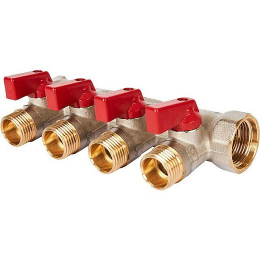 Коллектор распределительный с шаровыми кранами 3/4" с 4 отводами 1/2" (красные ручки), никелированный STOUT