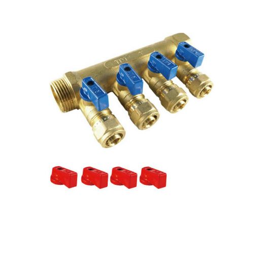 Коллектор распределительный с шаровыми кранами 3/4 с 4 выходами, красные и синие ручки TIM