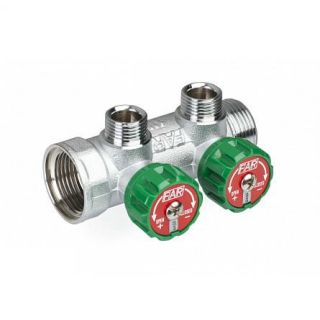 Гребенка проходная FAR FK 3821 с регулирующими вентилями (кранами) (НР-ВР) с 2 отводами. Ручки регулирующих вентилей комплектуются двусторонним сине-красным вкладышем. На вкладыше есть отверстие, в которое с помощью вторичных вкладышей-дисков можно установить наименования помещений. В случае необходимости Вы всегда можете приобрести у нас кран-буксу на замену для регулируемого коллектора MULTIFAR. Коллектор FAR FK 3821 позволяет не только полностью открыть/закрыть поток, но и точно регулировать расход по каждому потребителю.