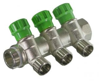Коллектор регулирующий используется в водоснабжении и отоплении для раздачи жидкости от магистрали к потребителям. Он дает возможность регулировки расхода носителя на каждой точке разбора. Корпус латунный и имеет сверху никелированное покрытие.