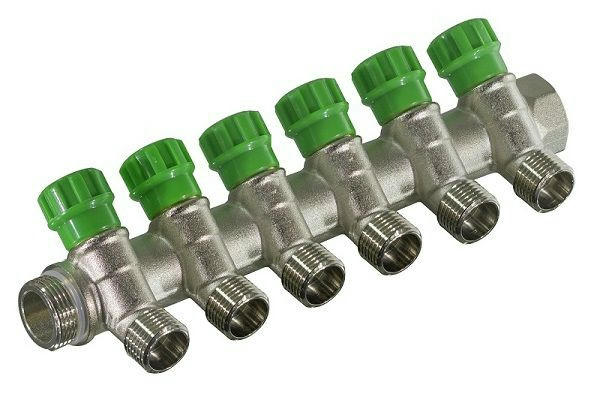 Коллектор регулирующий используется в водоснабжении и отоплении для раздачи жидкости от магистрали к потребителям. Он дает возможность регулировки расхода носителя на каждой точке разбора. Корпус латунный и имеет сверху никелированное покрытие.