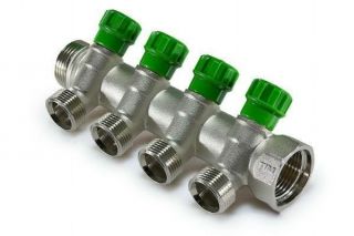 Коллектор регулирующий используется в водоснабжении и отоплении для раздачи жидкости от магистрали к потребителям. Он дает возможность регулировки расхода носителя на каждой точке разбора. Корпус латунный и имеет сверху никелированное покрытие.