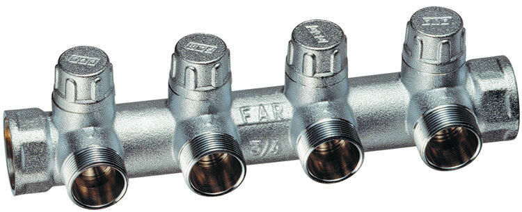 Коллектор запорный 3/4" ВР-ВР с 4 отводами 1/2" НР межосевое 45 мм FAR