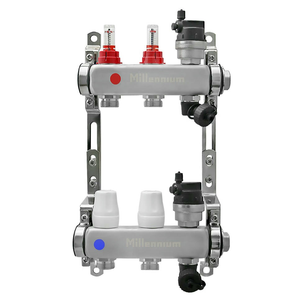 Коллекторная группа Millennium с расходомером для теплого пола - это идеальное решение для создания эффективной и надежной системы отопления в вашем доме или квартире. Она позволяет равномерно распределять теплоноситель по всем контурам теплого пола, обеспечивая равномерный прогрев помещения и экономию энергии.
