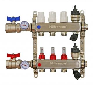 Коллекторная группа Millennium KGKR с кранами (с расходомерами) для теплого пола - это идеальное решение для создания эффективной и надежной системы отопления в вашем доме или квартире. Она позволяет равномерно распределять теплоноситель по всем контурам теплого пола, обеспечивая равномерный прогрев помещения и экономию энергии.