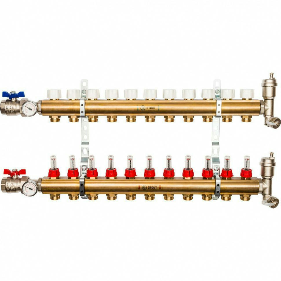 Распределительный коллектор из латуни с расходомерами на 11 выходов STOUT SMB 0473 000011 позволяет существенно повысить удобство эксплуатации отопительной системы, а также ее ремонтопригодность. Изделие изготовлено в Италии и отвечает всем стандартам качества. Наличие расходомеров позволяет настроить оптимальный расход горячей воды для всех контуров системы отопления и теплого пола. Устройство подходит для эксплуатации в квартирах и частных домах.
