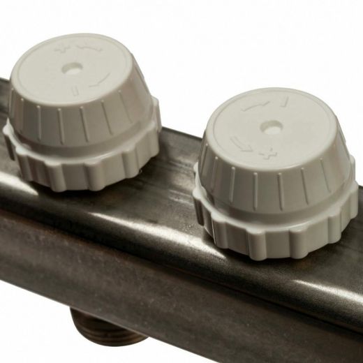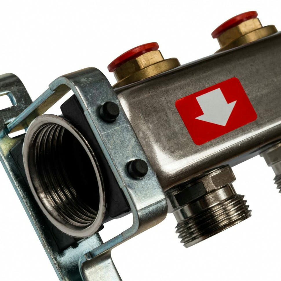 Коллектор STOUT 1" x 3/4" на 12 контуров для радиаторного отопления из нержавеющей стали SMS-0922-000012 предназначен для распределения теплоносителя с температурой до 90°С и давлением до 10 бар. Распределительные блоки STOUT серии SMS 0922 представляют собой подающие коллекторы с запорно-балансировочными клапанами и обратные коллекторы с терморегуляторами с регулирующим колпачком, смонтированные на цельнометаллических кронштейнах с межосевым расстоянием 211 мм и оснащённые штуцерами "под евроконус". Коллекторы изготовлены из нержавеющей стали AISI 304L.