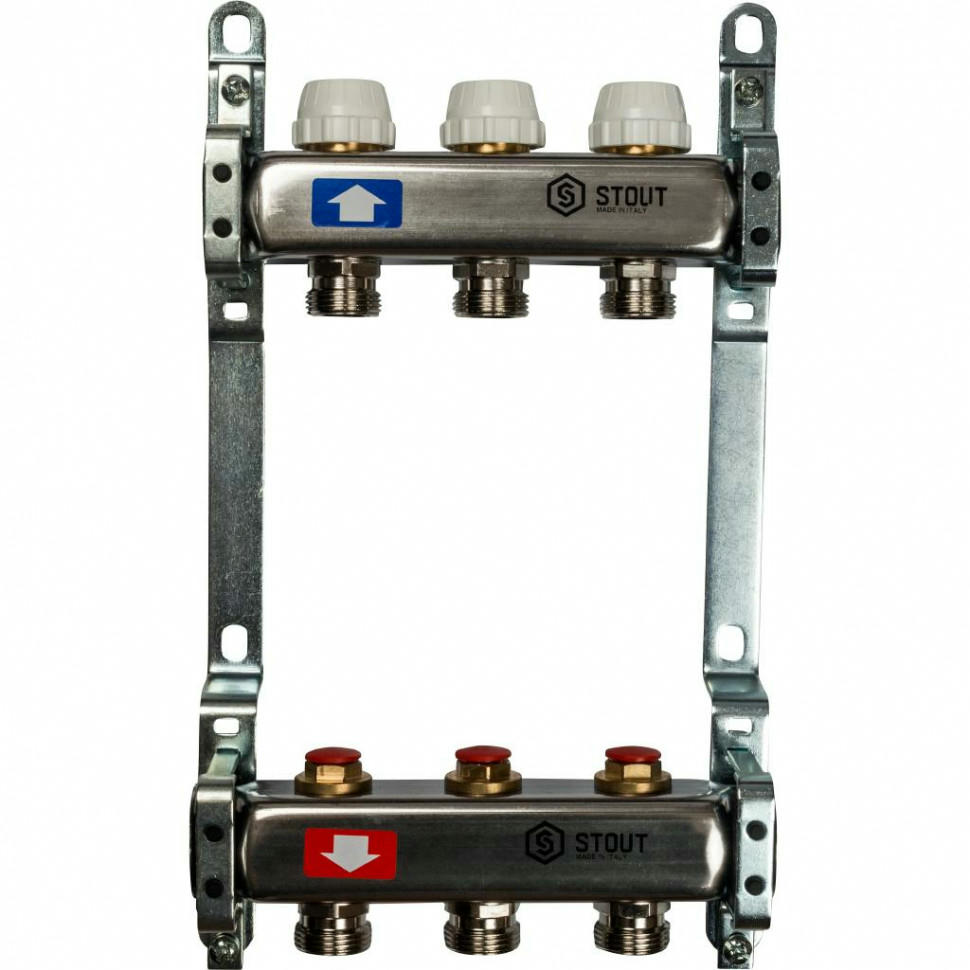 Коллектор STOUT 1" x 3/4" на 3 контура для радиаторного отопления из нержавеющей стали SMS-0922-000003 предназначен для распределения теплоносителя с температурой до 90°С и давлением до 10 бар. Распределительные блоки STOUT серии SMS 0922 представляют собой подающие коллекторы с запорно-балансировочными клапанами и обратные коллекторы с терморегуляторами с регулирующим колпачком, смонтированные на цельнометаллических кронштейнах с межосевым расстоянием 211 мм и оснащённые штуцерами "под евроконус". Коллекторы изготовлены из нержавеющей стали AISI 304L.
