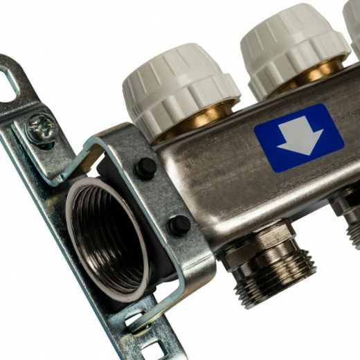 Оцените товар «Коллекторная группа из нержавеющей стали без расходомеров, с клапаном выпуска воздуха и сливом на 6 выходов STOUT»