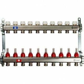 Коллекторы распределительные для систем водяного отопления и теплого водяного пола типа STOUT SMS 0917 000010 используются для контроля и распределения теплоносителя в системе отопления. Каждая труба отопительной системы водяного отопления или теплого водяного пола подключается к коллектору, что позволяет осуществлять контроль и регулировку потока теплоносителя индивидуально в каждом циркуляционном кольце. Распределительный коллектор состоит из подающей и обратной гребенок. Подающая гребенка имеет возможность отключения (перекрытия) каждого отдельного контура системы отопления, оснащается расходомерами. Обратная гребенка оборудуется терморегулирующими клапанами с предварительной настройкой пропускной способности. Терморегулирующие клапаны могут быть автоматизированы с помощью термоэлектрических сервоприводов; для ограничения расхода теплоносителя на каждый отвод используется предварительная настройка пропускной способности. Распределительные коллекторы для теплого пола состоят из двух гребенок, каждая из которых имеет от 3 до 13 выходов. Коллекторы могут быть укомплектованы шаровыми кранами для отключения от системы отопления, а также ручными или автоматическими воздушными клапанами, устанавливаемыми в конце каждого коллектора.