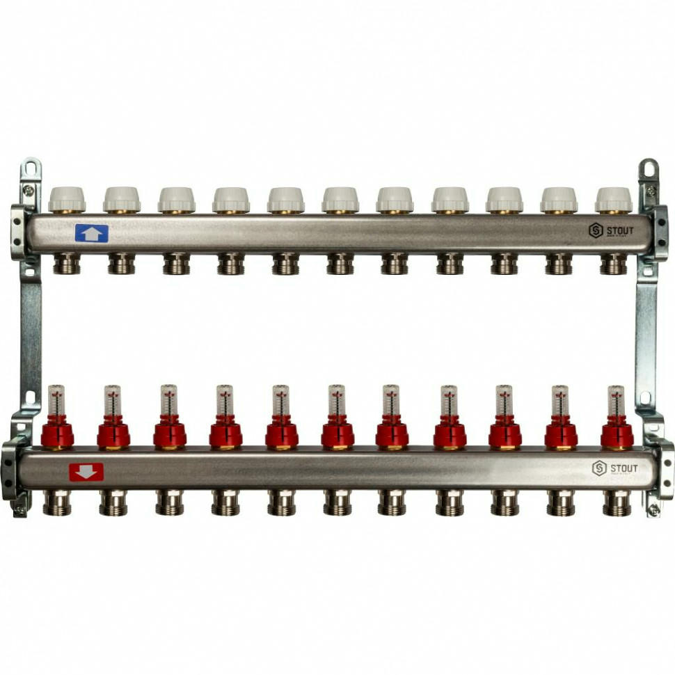 Коллекторы распределительные для систем водяного отопления и теплого водяного пола типа STOUT SMS 0917 000011 используются для контроля и распределения теплоносителя в системе отопления. Каждая труба отопительной системы водяного отопления или теплого водяного пола подключается к коллектору, что позволяет осуществлять контроль и регулировку потока теплоносителя индивидуально в каждом циркуляционном кольце. Распределительный коллектор состоит из подающей и обратной гребенок. Подающая гребенка имеет возможность отключения (перекрытия) каждого отдельного контура системы отопления, оснащается расходомерами. Обратная гребенка оборудуется терморегулирующими клапанами с предварительной настройкой пропускной способности. Терморегулирующие клапаны могут быть автоматизированы с помощью термоэлектрических сервоприводов; для ограничения расхода теплоносителя на каждый отвод используется предварительная настройка пропускной способности. Распределительные коллекторы для теплого пола состоят из двух гребенок, каждая из которых имеет от 3 до 13 выходов. Коллекторы могут быть укомплектованы шаровыми кранами для отключения от системы отопления, а также ручными или автоматическими воздушными клапанами, устанавливаемыми в конце каждого коллектора.