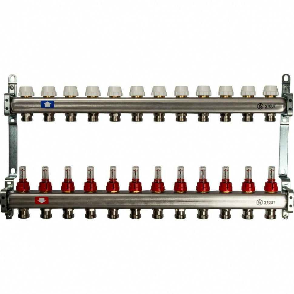 Коллекторы распределительные для систем водяного отопления и теплого водяного пола типа STOUT SMS 0917 000012 используются для контроля и распределения теплоносителя в системе отопления. Каждая труба отопительной системы водяного отопления или теплого водяного пола подключается к коллектору, что позволяет осуществлять контроль и регулировку потока теплоносителя индивидуально в каждом циркуляционном кольце. Распределительный коллектор состоит из подающей и обратной гребенок. Подающая гребенка имеет возможность отключения (перекрытия) каждого отдельного контура системы отопления, оснащается расходомерами. Обратная гребенка оборудуется терморегулирующими клапанами с предварительной настройкой пропускной способности. Терморегулирующие клапаны могут быть автоматизированы с помощью термоэлектрических сервоприводов; для ограничения расхода теплоносителя на каждый отвод используется предварительная настройка пропускной способности. Распределительные коллекторы для теплого пола состоят из двух гребенок, каждая из которых имеет от 3 до 13 выходов. Коллекторы могут быть укомплектованы шаровыми кранами для отключения от системы отопления, а также ручными или автоматическими воздушными клапанами, устанавливаемыми в конце каждого коллектора.
