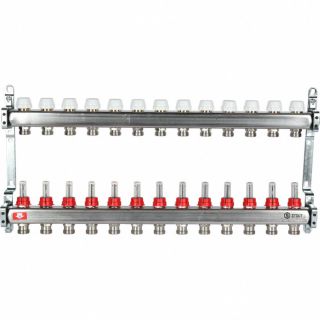 Коллекторы распределительные для систем водяного отопления и теплого водяного пола типа STOUT SMS 0917 000013 используются для контроля и распределения теплоносителя в системе отопления. Каждая труба отопительной системы водяного отопления или теплого водяного пола подключается к коллектору, что позволяет осуществлять контроль и регулировку потока теплоносителя индивидуально в каждом циркуляционном кольце. Распределительный коллектор состоит из подающей и обратной гребенок. Подающая гребенка имеет возможность отключения (перекрытия) каждого отдельного контура системы отопления, оснащается расходомерами. Обратная гребенка оборудуется терморегулирующими клапанами с предварительной настройкой пропускной способности. Терморегулирующие клапаны могут быть автоматизированы с помощью термоэлектрических сервоприводов; для ограничения расхода теплоносителя на каждый отвод используется предварительная настройка пропускной способности. Распределительные коллекторы для теплого пола состоят из двух гребенок, каждая из которых имеет от 3 до 13 выходов. Коллекторы могут быть укомплектованы шаровыми кранами для отключения от системы отопления, а также ручными или автоматическими воздушными клапанами, устанавливаемыми в конце каждого коллектора.
