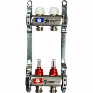 Коллекторы распределительные для систем водяного отопления и теплого водяного пола типа STOUT SMS 0917 000002 используются для контроля и распределения теплоносителя в системе отопления. Каждая труба отопительной системы водяного отопления или теплого водяного пола подключается к коллектору, что позволяет осуществлять контроль и регулировку потока теплоносителя индивидуально в каждом циркуляционном кольце. Распределительный коллектор состоит из подающей и обратной гребенок. Подающая гребенка имеет возможность отключения (перекрытия) каждого отдельного контура системы отопления, оснащается расходомерами. Обратная гребенка оборудуется терморегулирующими клапанами с предварительной настройкой пропускной способности. Терморегулирующие клапаны могут быть автоматизированы с помощью термоэлектрических сервоприводов; для ограничения расхода теплоносителя на каждый отвод используется предварительная настройка пропускной способности. Распределительные коллекторы для теплого пола состоят из двух гребенок, каждая из которых имеет от 3 до 13 выходов. Коллекторы могут быть укомплектованы шаровыми кранами для отключения от системы отопления, а также ручными или автоматическими воздушными клапанами, устанавливаемыми в конце каждого коллектора.