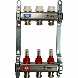 Коллекторы распределительные для систем водяного отопления и теплого водяного пола типа STOUT SMS 0917 000003 используются для контроля и распределения теплоносителя в системе отопления. Каждая труба отопительной системы водяного отопления или теплого водяного пола подключается к коллектору, что позволяет осуществлять контроль и регулировку потока теплоносителя индивидуально в каждом циркуляционном кольце. Распределительный коллектор состоит из подающей и обратной гребенок. Подающая гребенка имеет возможность отключения (перекрытия) каждого отдельного контура системы отопления, оснащается расходомерами. Обратная гребенка оборудуется терморегулирующими клапанами с предварительной настройкой пропускной способности. Терморегулирующие клапаны могут быть автоматизированы с помощью термоэлектрических сервоприводов; для ограничения расхода теплоносителя на каждый отвод используется предварительная настройка пропускной способности. Распределительные коллекторы для теплого пола состоят из двух гребенок, каждая из которых имеет от 3 до 13 выходов. Коллекторы могут быть укомплектованы шаровыми кранами для отключения от системы отопления, а также ручными или автоматическими воздушными клапанами, устанавливаемыми в конце каждого коллектора.