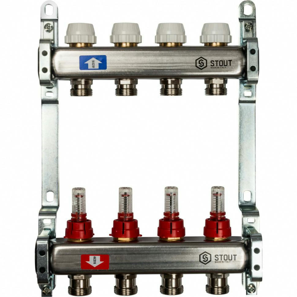 Коллекторы распределительные для систем водяного отопления и теплого водяного пола типа STOUT SMS 0917 000004 используются для контроля и распределения теплоносителя в системе отопления. Каждая труба отопительной системы водяного отопления или теплого водяного пола подключается к коллектору, что позволяет осуществлять контроль и регулировку потока теплоносителя индивидуально в каждом циркуляционном кольце. Распределительный коллектор состоит из подающей и обратной гребенок. Подающая гребенка имеет возможность отключения (перекрытия) каждого отдельного контура системы отопления, оснащается расходомерами. Обратная гребенка оборудуется терморегулирующими клапанами с предварительной настройкой пропускной способности. Терморегулирующие клапаны могут быть автоматизированы с помощью термоэлектрических сервоприводов; для ограничения расхода теплоносителя на каждый отвод используется предварительная настройка пропускной способности. Распределительные коллекторы для теплого пола состоят из двух гребенок, каждая из которых имеет от 3 до 13 выходов. Коллекторы могут быть укомплектованы шаровыми кранами для отключения от системы отопления, а также ручными или автоматическими воздушными клапанами, устанавливаемыми в конце каждого коллектора.