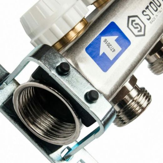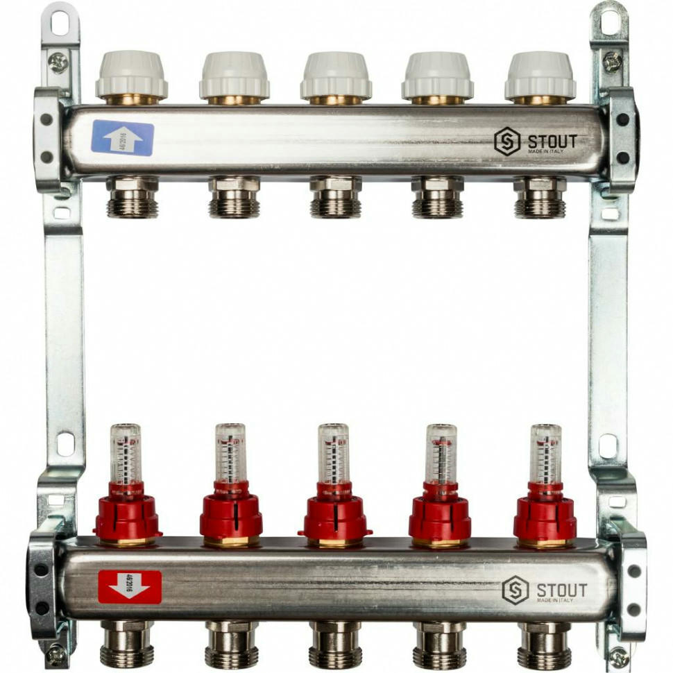 Коллекторы распределительные для систем водяного отопления и теплого водяного пола типа STOUT SMS 0917 000005 используются для контроля и распределения теплоносителя в системе отопления. Каждая труба отопительной системы водяного отопления или теплого водяного пола подключается к коллектору, что позволяет осуществлять контроль и регулировку потока теплоносителя индивидуально в каждом циркуляционном кольце. Распределительный коллектор состоит из подающей и обратной гребенок. Подающая гребенка имеет возможность отключения (перекрытия) каждого отдельного контура системы отопления, оснащается расходомерами. Обратная гребенка оборудуется терморегулирующими клапанами с предварительной настройкой пропускной способности. Терморегулирующие клапаны могут быть автоматизированы с помощью термоэлектрических сервоприводов; для ограничения расхода теплоносителя на каждый отвод используется предварительная настройка пропускной способности. Распределительные коллекторы для теплого пола состоят из двух гребенок, каждая из которых имеет от 3 до 13 выходов. Коллекторы могут быть укомплектованы шаровыми кранами для отключения от системы отопления, а также ручными или автоматическими воздушными клапанами, устанавливаемыми в конце каждого коллектора.