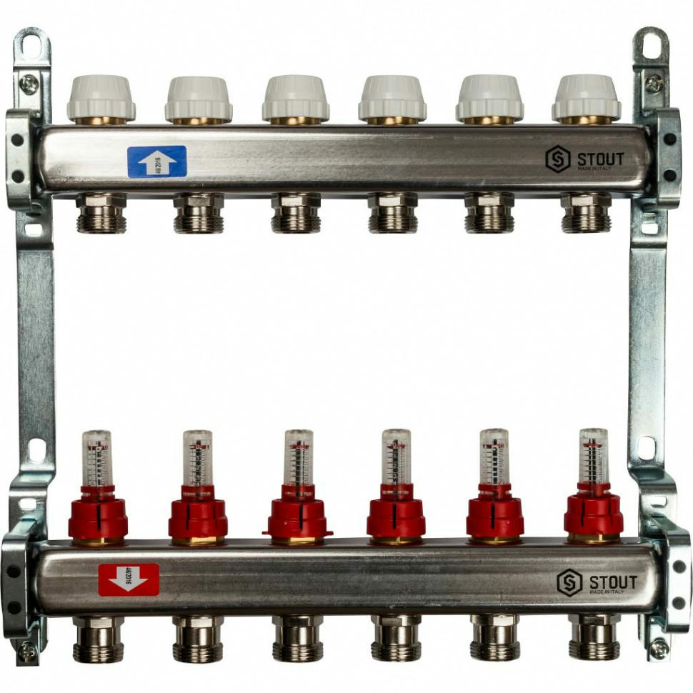 Коллекторы распределительные для систем водяного отопления и теплого водяного пола типа STOUT SMS 0917 000006 используются для контроля и распределения теплоносителя в системе отопления. Каждая труба отопительной системы водяного отопления или теплого водяного пола подключается к коллектору, что позволяет осуществлять контроль и регулировку потока теплоносителя индивидуально в каждом циркуляционном кольце. Распределительный коллектор состоит из подающей и обратной гребенок. Подающая гребенка имеет возможность отключения (перекрытия) каждого отдельного контура системы отопления, оснащается расходомерами. Обратная гребенка оборудуется терморегулирующими клапанами с предварительной настройкой пропускной способности. Терморегулирующие клапаны могут быть автоматизированы с помощью термоэлектрических сервоприводов; для ограничения расхода теплоносителя на каждый отвод используется предварительная настройка пропускной способности. Распределительные коллекторы для теплого пола состоят из двух гребенок, каждая из которых имеет от 3 до 13 выходов. Коллекторы могут быть укомплектованы шаровыми кранами для отключения от системы отопления, а также ручными или автоматическими воздушными клапанами, устанавливаемыми в конце каждого коллектора.