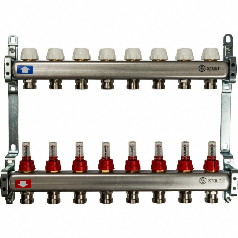 Коллекторы распределительные для систем водяного отопления и теплого водяного пола типа STOUT SMS 0917 000008 используются для контроля и распределения теплоносителя в системе отопления. Каждая труба отопительной системы водяного отопления или теплого водяного пола подключается к коллектору, что позволяет осуществлять контроль и регулировку потока теплоносителя индивидуально в каждом циркуляционном кольце. Распределительный коллектор состоит из подающей и обратной гребенок. Подающая гребенка имеет возможность отключения (перекрытия) каждого отдельного контура системы отопления, оснащается расходомерами. Обратная гребенка оборудуется терморегулирующими клапанами с предварительной настройкой пропускной способности. Терморегулирующие клапаны могут быть автоматизированы с помощью термоэлектрических сервоприводов; для ограничения расхода теплоносителя на каждый отвод используется предварительная настройка пропускной способности. Распределительные коллекторы для теплого пола состоят из двух гребенок, каждая из которых имеет от 3 до 13 выходов. Коллекторы могут быть укомплектованы шаровыми кранами для отключения от системы отопления, а также ручными или автоматическими воздушными клапанами, устанавливаемыми в конце каждого коллектора.