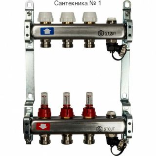 Коллекторная группа с запорными кранами из нержавеющей стали с расходомерами на 3 выхода STOUT