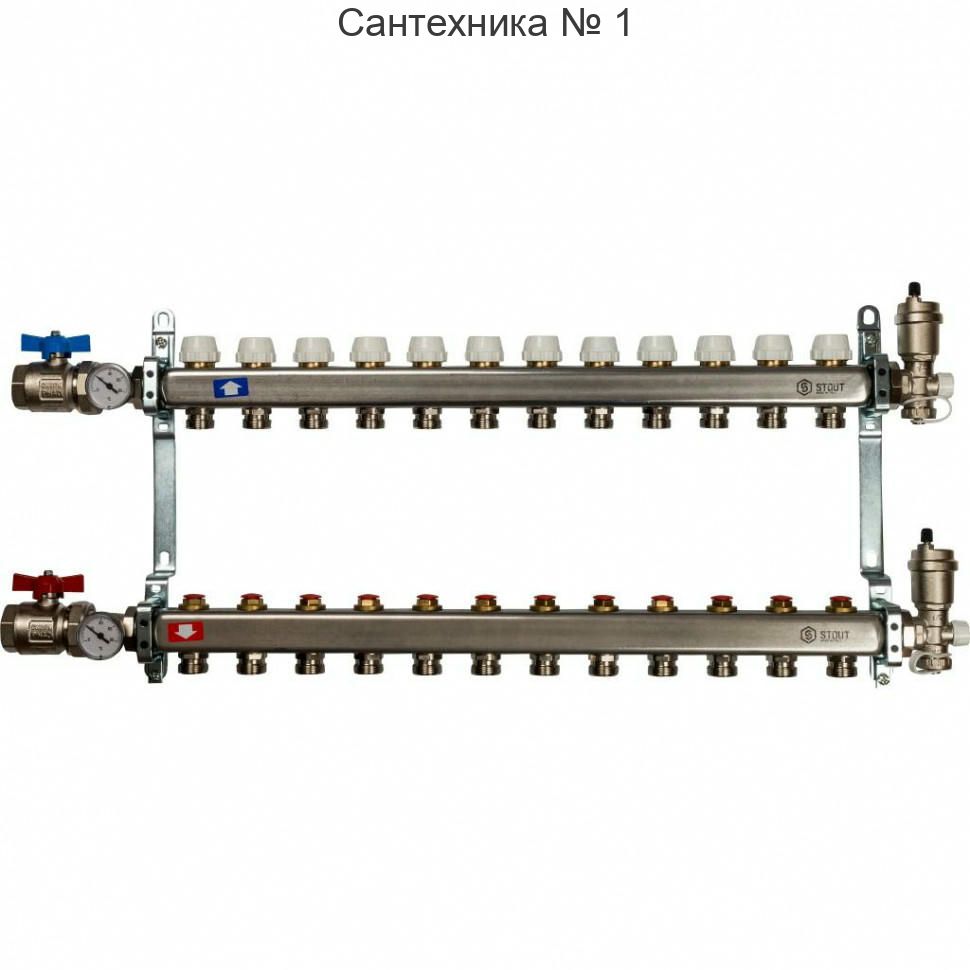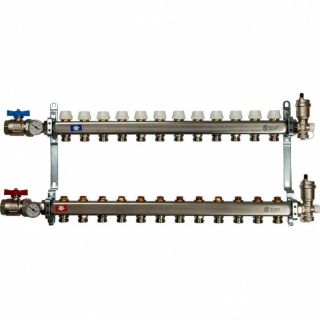Коллектор STOUT 1"x3/4" 12 контуров для радиаторного отопления из нержавеющей стали SMS-0912-000012 предназначен для распределения теплоносителя с температурой до 80°С и давлением до 10 бар. Распределительные блоки STOUT серии SMS 0912 представляют собой подающие коллекторы с запорно-балансировочными клапанами под сервоприводы и обратные коллекторы с терморегуляторами с регулирующим колпачком, смонтированные на цельнометаллических кронштейнах с межосевым расстоянием 211 мм и оснащённые штуцерами "под евроконус". Помимо этого блоки укомплектованы двумя шаровыми кранами с "американкой", двумя вставками со стрелочным термометром, двумя концевыми фитингами с воздухоотводчиками и дренажными кранами с крышкой-ключом.