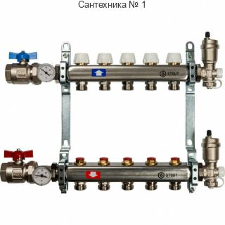 Коллектор STOUT 1"x3/4" 5 контуров для радиаторного отопления из нержавеющей стали SMS-0912-000005 предназначен для распределения теплоносителя с температурой до 80°С и давлением до 10 бар. Распределительные блоки STOUT серии SMS 0912 представляют собой подающие коллекторы с запорно-балансировочными клапанами под сервоприводы и обратные коллекторы с терморегуляторами с регулирующим колпачком, смонтированные на цельнометаллических кронштейнах с межосевым расстоянием 211 мм и оснащённые штуцерами "под евроконус". Помимо этого блоки укомплектованы двумя шаровыми кранами с "американкой", двумя вставками со стрелочным термометром, двумя концевыми фитингами с воздухоотводчиками и дренажными кранами с крышкой-ключом.