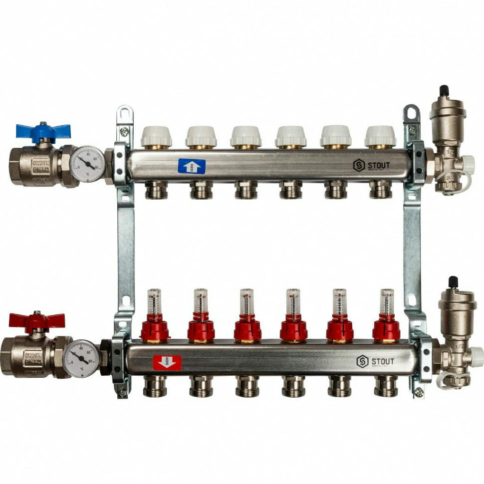 Коллекторные блоки STOUT производятся в Италии под тщательным контролем, проходя многочисленные тесты и сертификацию оборудования. Благодаря этому распределительные коллекторы STOUT обладают рядом преимуществ, среди которых надежность конструкции, качественные материалы, оптимальная комплектация блока, варианты исполнения для теплого пола и для радиаторной разводки.