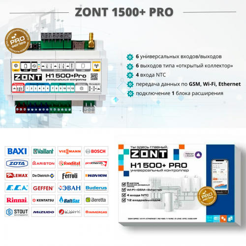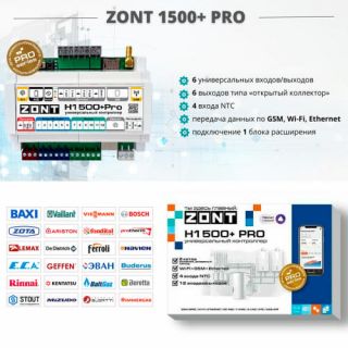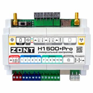 Универсальный контроллер ZONT H1500+ PRO обладает широким функционалом и подходит для контроля и управления сложными системами отопления. Прибор является современной версией контроллера ZONT H1000+ и соответствует профессиональным стандартам ZONT. Контроллер ZONT Н1500+ PRO предназначен для профессиональной автоматизации инженерных систем и дистанционного управления ими. Контролирует и управляет системой отопления с функцией приготовления горячей воды. Прибор обладает возможностями гибкого программирования для решения задач автоматизации котельной. Алгоритм работы контроллера может учитывать температуру наружного воздуха и недельное расписание.