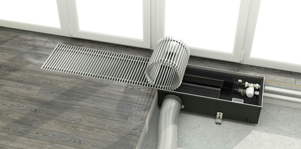 Встраиваемый в пол конвектор с естественной конвекцией Varmann Ntherm Air - это готовый к монтажу отопительный прибор, предназначенный для изоляции от холодного воздуха больших, доходящих до пола окон, а так же встраивания в подоконник. Конструкцией конвектора предусмотрен подвод приточного воздуха от системы вентиляции и равномерном распределение его в воздухораздающем модуле по все длине конвектора. Имеется возможность регулирования подачи воздуха на теплообменник конвектора шиберной заслонкой. Возможна работа конвектора Ntherm Air в системе холодоснабжения с возможностью дренажа конденсата.