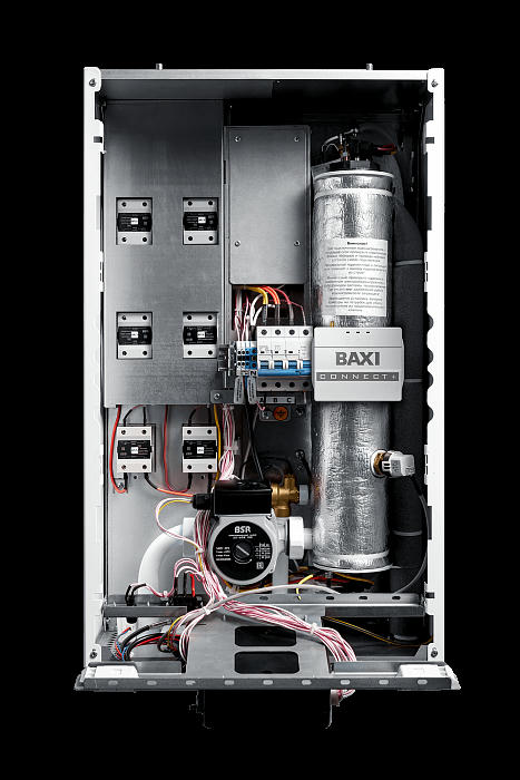 Главная особенность электрического котла BAXI AMPERA Pro - в нем используются твердотельные реле с воздушными охлаждением. Применение данной технологии дает большое количество преимуществ: гораздо больший эксплуатационный ресурс, высокое быстродействие, отсутствие механической контактной группы, бесшумность, гальваническая развязка от управляющей цепи и высокая надежность. Модельный ряд начинается с котлов мощностью 9 кВт, они могу быть как однофазными, так и трехфазными. Модели от 12 до 45 кВт поставляются в трёхфазном исполнении. Еще одним преимуществом котлов AMPERA Pro является улучшенная модуляция мощности. Модели от 9 кВт до 24 кВт имеют 6 ступеней модуляции мощности, а модели от 30 до 45 кВт - 9 ступеней. Это позволяет более точно регулировать мощность котла в соответствии с потребностями, что обеспечивает экономию энергопотребления и повышает комфорт и безопасность. AMPERA Pro оснащен разъемом OpenTherm и дин-рейкой внутри котла для быстрой и удобной установки системы удаленного управления BAXI Connect+.