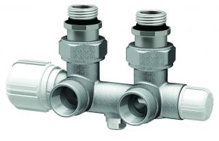 Н-образный термостатический узел с запорными клапанами М24х19 х НР 1/2", угловой FAR